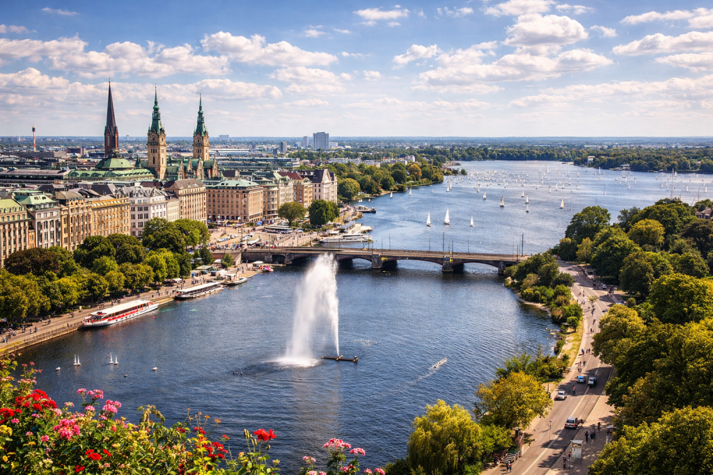 Binnenalster und Außenalster in Hamburg mit Wasserfläche und Stadtpanorama