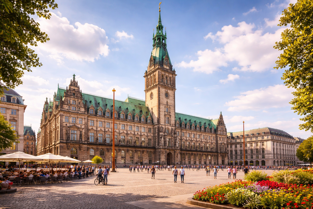 Rathaus Hamburg mit historischer Fassade und Rathausmarkt